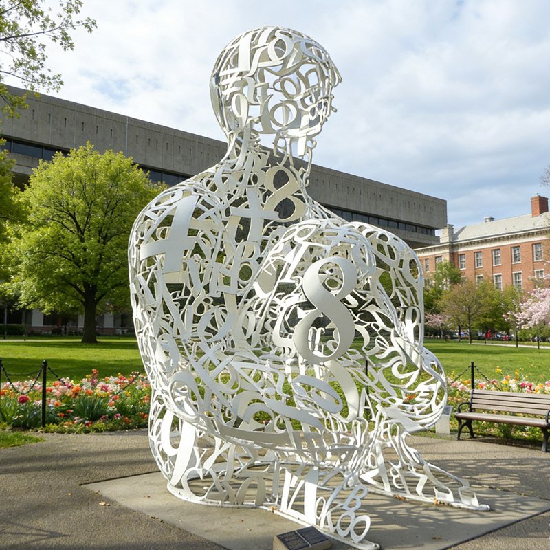 What makes this work especially intriguing is the way language itself becomes structure. A seemingly chaotic arrangement of signs and symbols is transformed into a calm, thoughtful human figure. Through the many holes and gaps created by the layered characters, the surrounding environment becomes part of the sculpture, giving the space an open and imaginative quality.