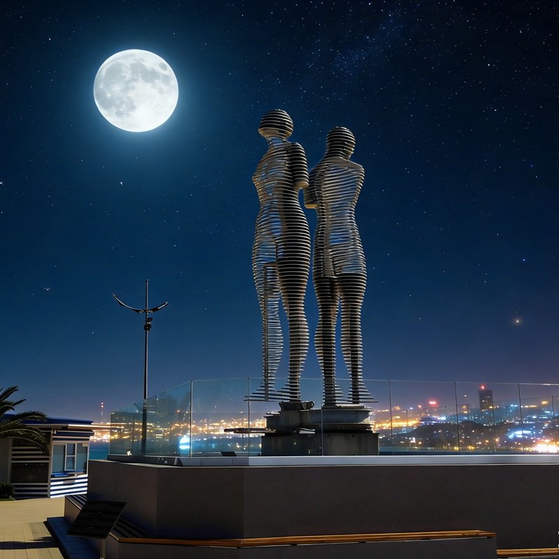 The sculpture is based on the protagonists of the novel Ali and Nino, which tells the story of a love that transcends religious, ethnic, and cultural boundaries between Ali, a young Azerbaijani Muslim, and Nino, a young Georgian Christian woman. Every evening, the two figures slowly move toward each other, briefly merging before separating again.