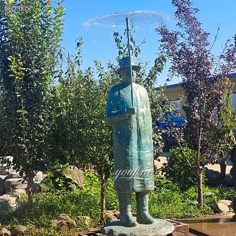 The umbrella man statue is cast from high-quality bronze material and depicts a man standing holding an umbrella.