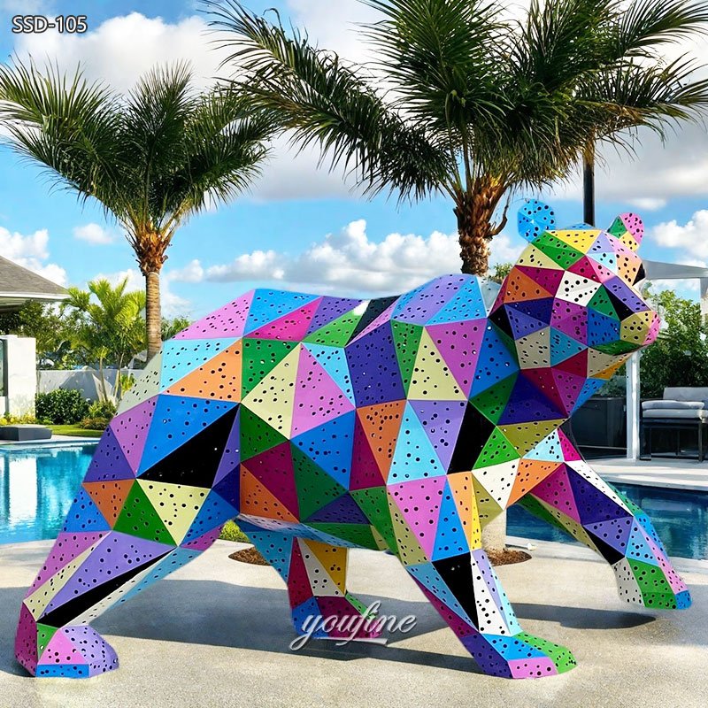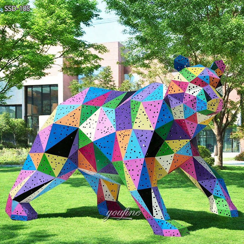 A colorful geometric bear statue instantly attracts people’s attention. The bright colors shine in the sun. Placing this metal geometric bear in a hotel or commercial district can attract more people.