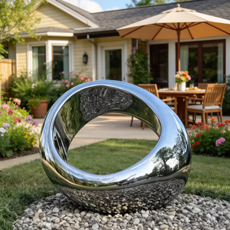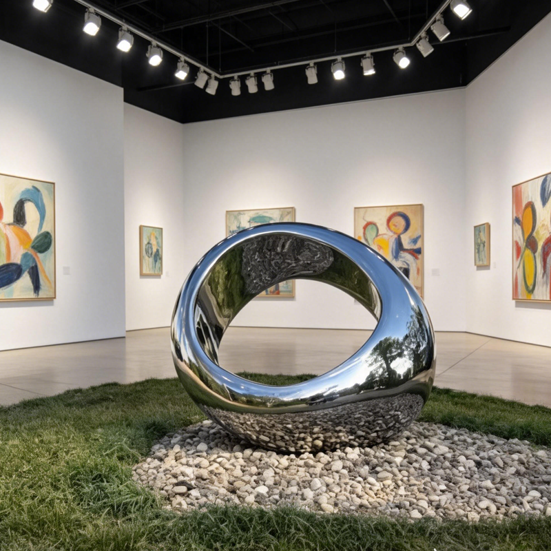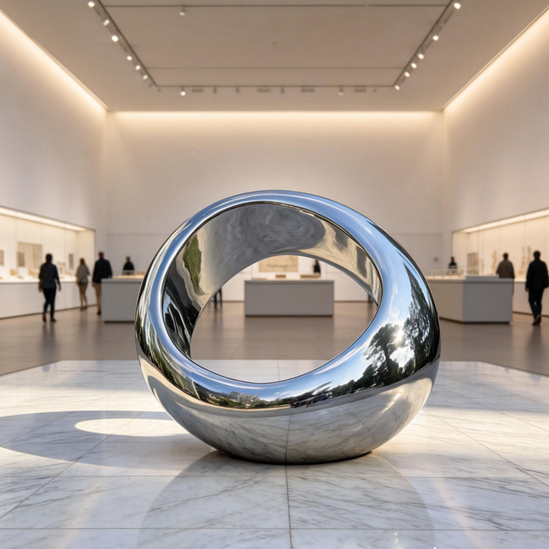 With an unbroken oval loop as its defining form, this statue unfolds as a single continuous gesture.Its surface transitions effortlessly along fluid curves, shaping a cohesive silhouette—like a whirlpool suspended in motion. The mirror-polished finish brings out the stainless steel’s natural sheen, creating open,inclusive presence.