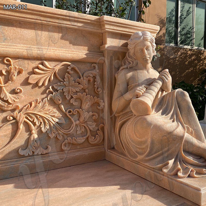 This exquisite marble garden bench is an outdoor piece of art, hand-carved by skilled artists from the finest sunset red marble. Its appearance is stunning, with intricate floral carvings adorning the backrest and armrests, creating an intricate and ornate design that is eye-catching. The smooth, polished marble surface reflects beautiful light, adding depth and warmth to the piece.
