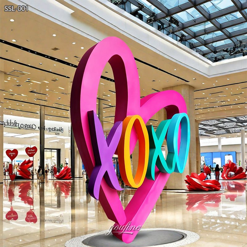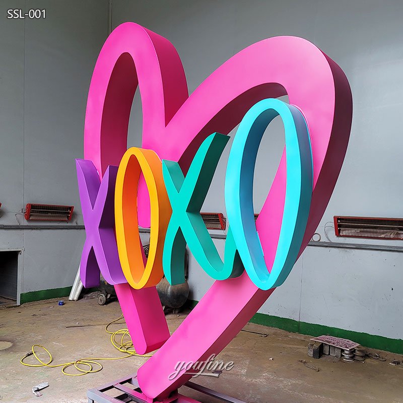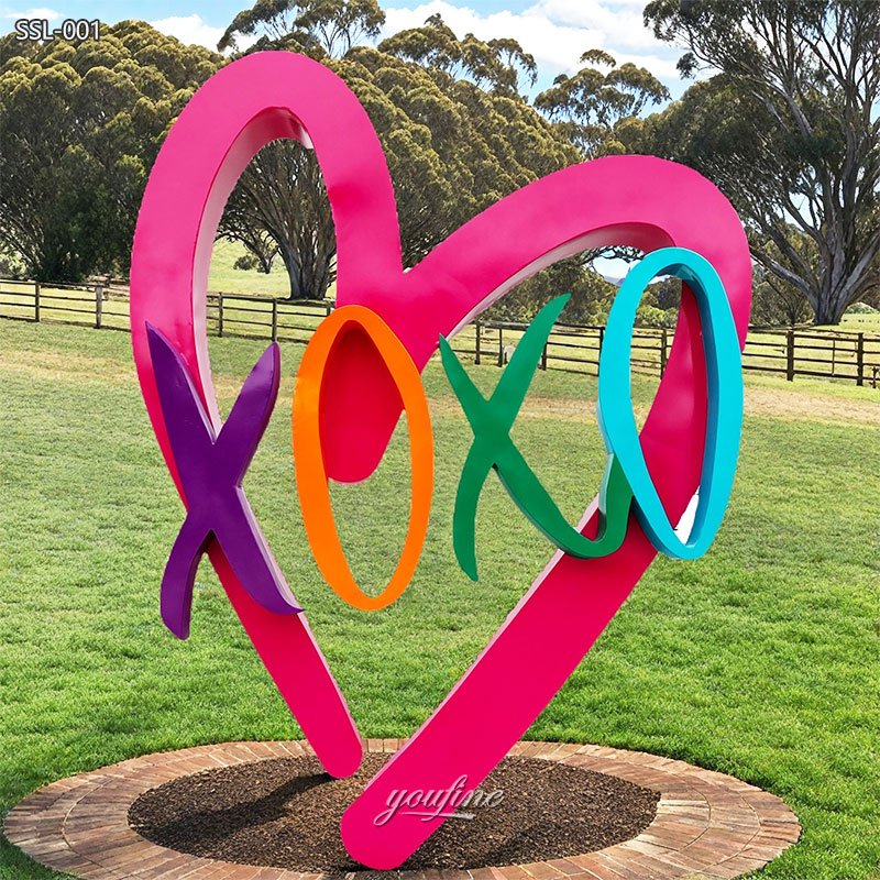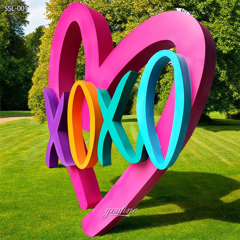 This steel heart sculpture features a vibrant pink background and the letters “XOXO” in vibrant purple, orange, green, and blue. The vibrant colors are incredibly eye-catching and a visual feast for any occasion.